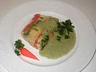 Inzwischen die Soße zubereiten: Kresse und Zwiebeln klein schneiden und in Gemüsebrühe aufkochen. Im Mixer prürieren, mit Creme double glattrühren, Sherry dazu geben, nochmal aufkochen und etwas reduzieren lassen. Vom Herd nehmen und abkühlen lassen