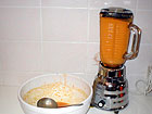 Durch ein Sieb geben, feste Bestandteile mit 1-2 Schöpfkellen der Flüssigkeit im Mixer pürieren. Wenn nötig weitere Flüssigkeit dazu geben. Die cremige Masse mit der restlichen Flüssigkeit ein weiteres Mal pürieren,