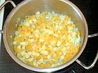 Gelatine in kaltem Wasser einweichen. 80g des Parmesan fein reiben. Vom Rest Hobelspan-ähnliche Stücke für die spätere Garnitur erstellen. Zwiebel, geputzte Paprika und Kartoffeln fein würfeln und bei mittlerer Hitze im Öl glasig andünsten. Mit Gemüsefond und Milch auffüllen, kurz aufkochen und bei kleiner Hitze mit geschlossenem Deckel 20min. köcheln lassen.