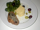 Am nächsten Tag aus der Form stürzen und in ca. 2cm breite Stücke teilen - oder, wenn aus der Schüssel, mit feuchten Löffeln Nocken abstechen. Zum garnieren Feldsalat putzen und waschen ... blaue und gelbe Weintrauben halbieren, teilweise vierteln und ggf. entkernen. Mittlere Fläche des Tellers mit Parmesan-Streusel bestreuen, pro Person ein oder zwei Stückchen der Mousse auf einem Teller anrichten und mit Feldsalatröschen und Traubenragout garnieren. Dazu passt frisches Knoblauch- oder Olivenbrot.