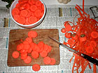 Möhren putzen und in 2-3mm dicke Scheiben Schneiden Knoblauch schälen und mit breitem Messer flach drücken Zwiebel fein würfeln und zusammen mit Knoblauch in Olivenöl bei mitlerer Hitze glasig andünsten Karotten dazugeben und ca. 5 min. anrösten Mit Hühnerbrühe ablöschen und 5 min köcheln