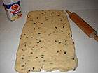 man etwas Mehl hinzu. Der Teig wird zu einer großen Platte von etwa 60x40 cm ausgerollt. Die Teigplatte in vier gleich große Stücke