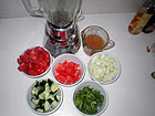 Gemüse putzen/entkernen und in grobe Würfel schneiden. Mit zerdrücktem Knoblauch portionsweise im Mixer pürieren. Dabei darauf achten, dass in jeder Portion jeweils ALLE Gemüsesorten enthalten sind. Am besten Tomaten und Gurken zuerst in den Mixer geben, dann "rückt" der Rest von alleine nach. Bei Bedarf etwas Gemüsebrühe dazugeben.