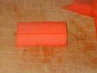 Ein etwa 5cm langes Stück einer geputzen Karotte zum Quader zurecht schneiden. Teile von der Mittel-Linie der Fläche am einen Ende zu den Außenkanten des gegenüberliegenden Endes wegschneiden, sodass ein Keil entsteht. Möhre um 90 Grad drehen und von der Mitte der spitzen Kante zu den anderen beiden Kanten des flachen Endes schneiden. Wir haben jetzt eine kleine Pyramide. Die Ecken an der Seite mit dem flachen Ende bis zu jeweils ca. einem Viertel der Kantenlänge nach rechts und links abschrägen. Jetzt ist die gewünschte Form schon gut zu erkennen. Alle Kanten abrunden. Möhrchen in kochendem Salzwasser ca. 3 min angaren. In das abgerundete Ende mit einem Zahnstocher ein kleines Loch bohren und ein Stück krause Petersilie einstecken, fertig ist das Deko-Möhrchen :-) Die Gäste sind garantiert(!!!!) begeistert.