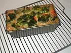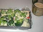 Kastenform (ca. 22cm) mit Klarsichtfolie auslegen und mit flüssiger Butter auspinseln. Gemüse in die Form schichten: 1. Hälfte der Karotten, 1. Hälfte Brocccoli, Blumenkohl, 2. Hälfte Karotten, 2. Hälfte Broccoli. Eiersahne darüber gießen.