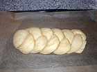 Den gedehnten Teig nochmal leicht durchkneten und in drei gleiche Portionen teilen. Jeden Teil mit bemehlten Händen zu einem ca. 50cm langen Strang walken. Auf einem mit Backpapier ausgelegten Blech aus den drei Teigsträngen eine schönen Zopf flechten.