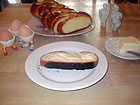 Tipp: Eine ofenfeste Schüssel mit Wasser im Backofen verhindert ein Austrocknen der Oberfläche. Schmeckt am besten mit frischer Butter. Im Hunsrück ist der Hefezop mit frischer Butter und bunten Eiern (ca. 7 min gekocht) das traditionelle Osterfrühstück.