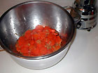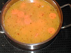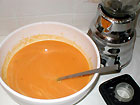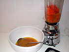 Durch ein Sieb geben, feste Bestandteile mit 1-2 Schöpfkellen der Flüssigkeit im Mixer pürieren. Wenn nötig weitere Flüssigkeit dazu geben. Die cremige Masse mit der restlichen Flüssigkeit ein weiteres Mal pürieren,