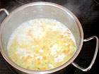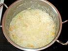 Gelatine in kaltem Wasser einweichen. 80g des Parmesan fein reiben. Vom Rest Hobelspan-ähnliche Stücke für die spätere Garnitur erstellen. Zwiebel, geputzte Paprika und Kartoffeln fein würfeln und bei mittlerer Hitze im Öl glasig andünsten. Mit Gemüsefond und Milch auffüllen, kurz aufkochen und bei kleiner Hitze mit geschlossenem Deckel 20min. köcheln lassen.