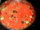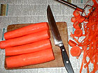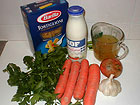 Möhren putzen und in 2-3mm dicke Scheiben Schneiden Knoblauch schälen und mit breitem Messer flach drücken Zwiebel fein würfeln und zusammen mit Knoblauch in Olivenöl bei mitlerer Hitze glasig andünsten Karotten dazugeben und ca. 5 min. anrösten Mit Hühnerbrühe ablöschen und 5 min köcheln